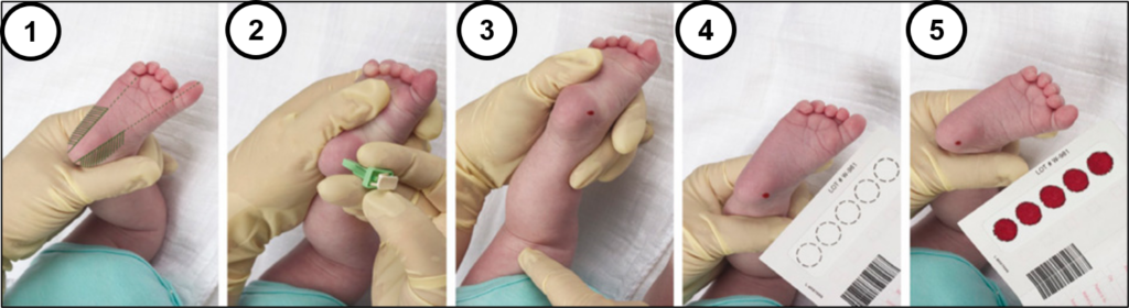 Realizar la punción con una lanceta estéril especial para este tipo de tomas que tenga una punta no mayor a 2.0 mm y únicamente en el área sombreada (recomendaciones de Blumenfeld). Mantenga la lanceta al menos 3 segundos sobre el área de punción y retire.